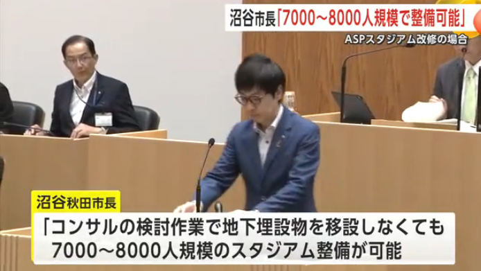 17日の秋田市議会一般質問で、議員から改修について問われると、沼谷市長は「コンサルタントの検討作業で、地下の埋設物を移設しない場合でも7000人から8000人規模のスタジアムの整備が可能と見込んでいる。埋設物を移設すると6年以上の工事期間が想定されるため、移設しない前提でスタジアムの配置を検討する」と述べ、改修でもスケジュールに遅れは生じないと明らかにしました。