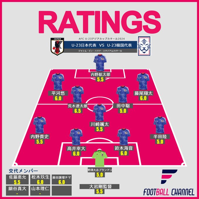 サッカーU-23日本代表は22日、AFC U-23アジアカップカタール2024でU-23韓国代表と対戦し、0-1で敗北。この試合で大岩ジャパンのパフォーマンスはどうだったのだろうか。フットボールチャンネルでは、U-23韓国代表戦に出場した選手(出場時間の短い選手は除く)、監督のパフォーマンスをどこよりも早く採点する。