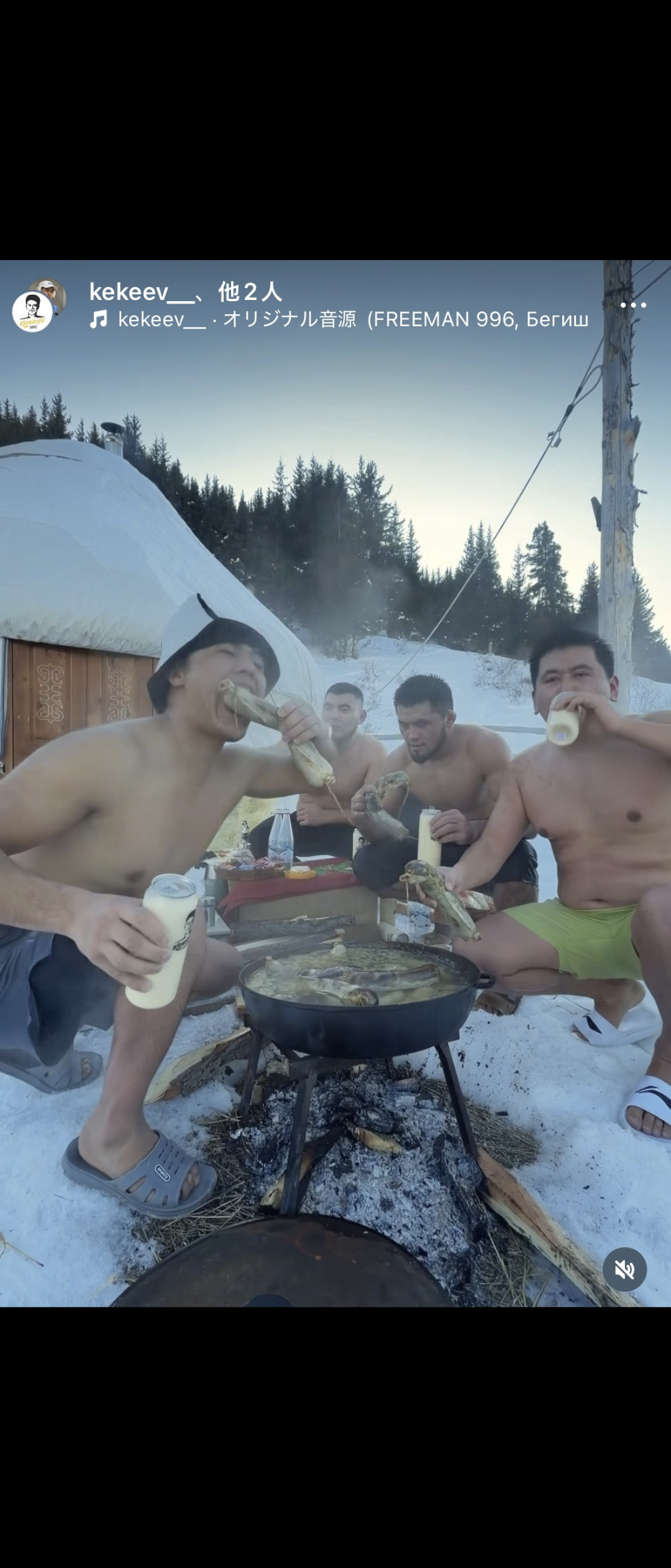 🇰🇬→極寒の中、上裸で川の中に入り腸詰め?らしきものを貪り食う