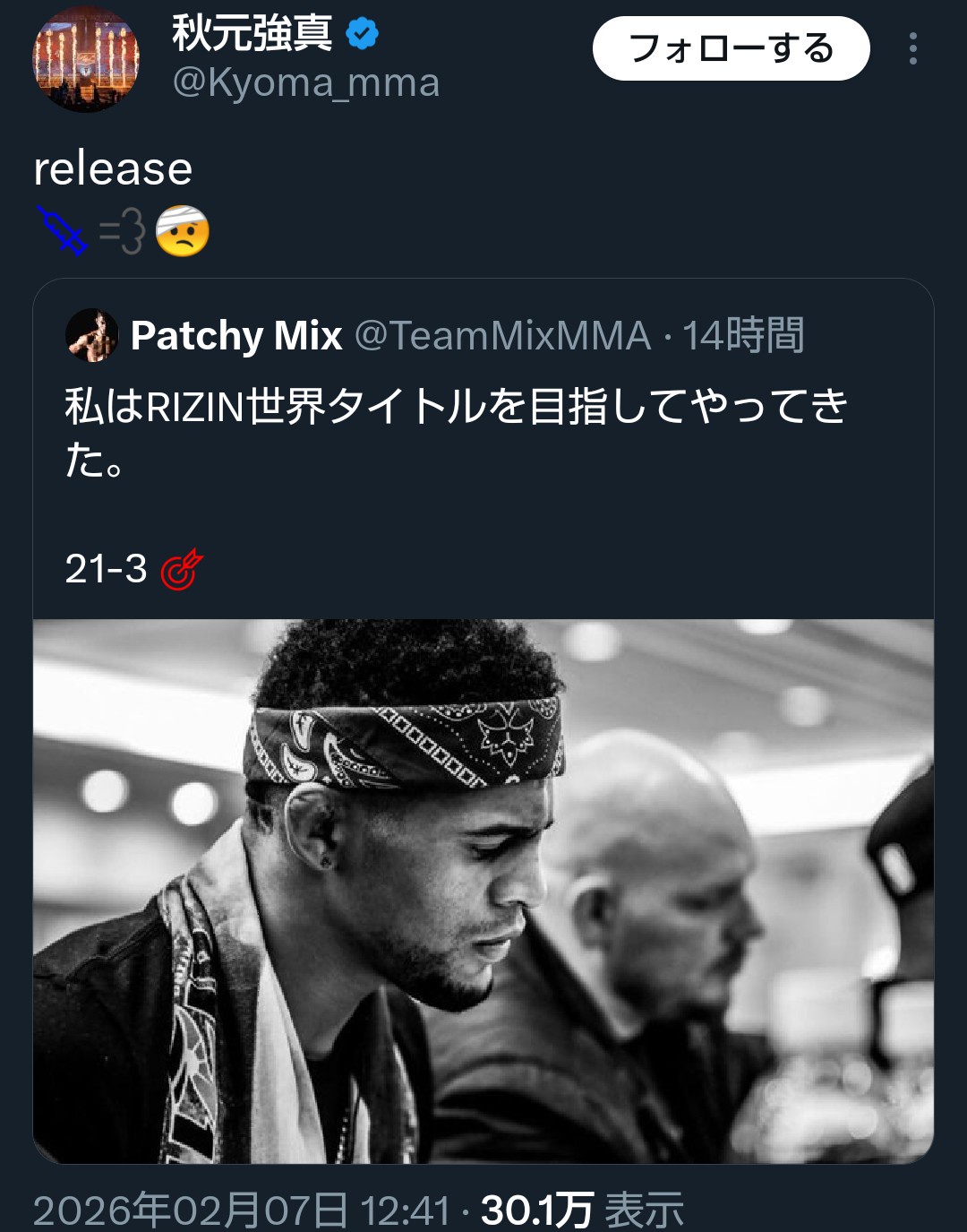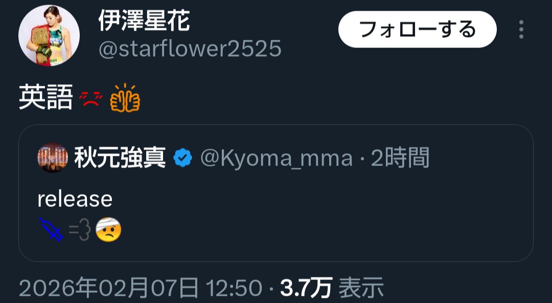 💉💨🤕 https://t.co/KAj3ydYNap— 秋元強真 (@Kyoma_mma) February 7, 2026