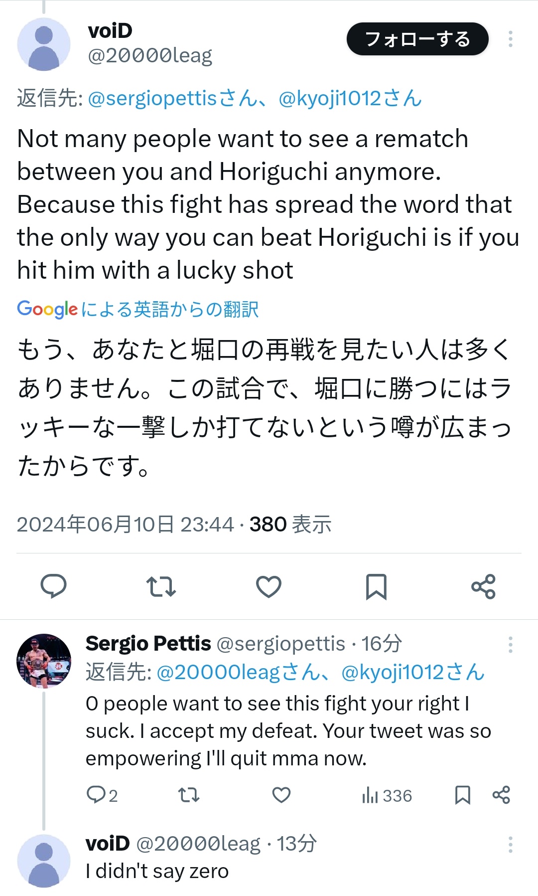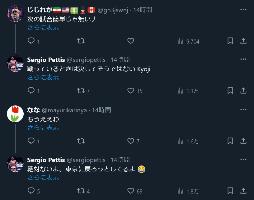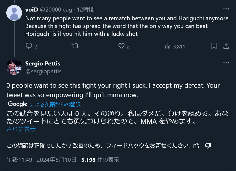 ペティスの引退ツイートに「扇久保と15分間ゲ〇のように抱き合うことから逃げるな!」ってリプつけてやったww