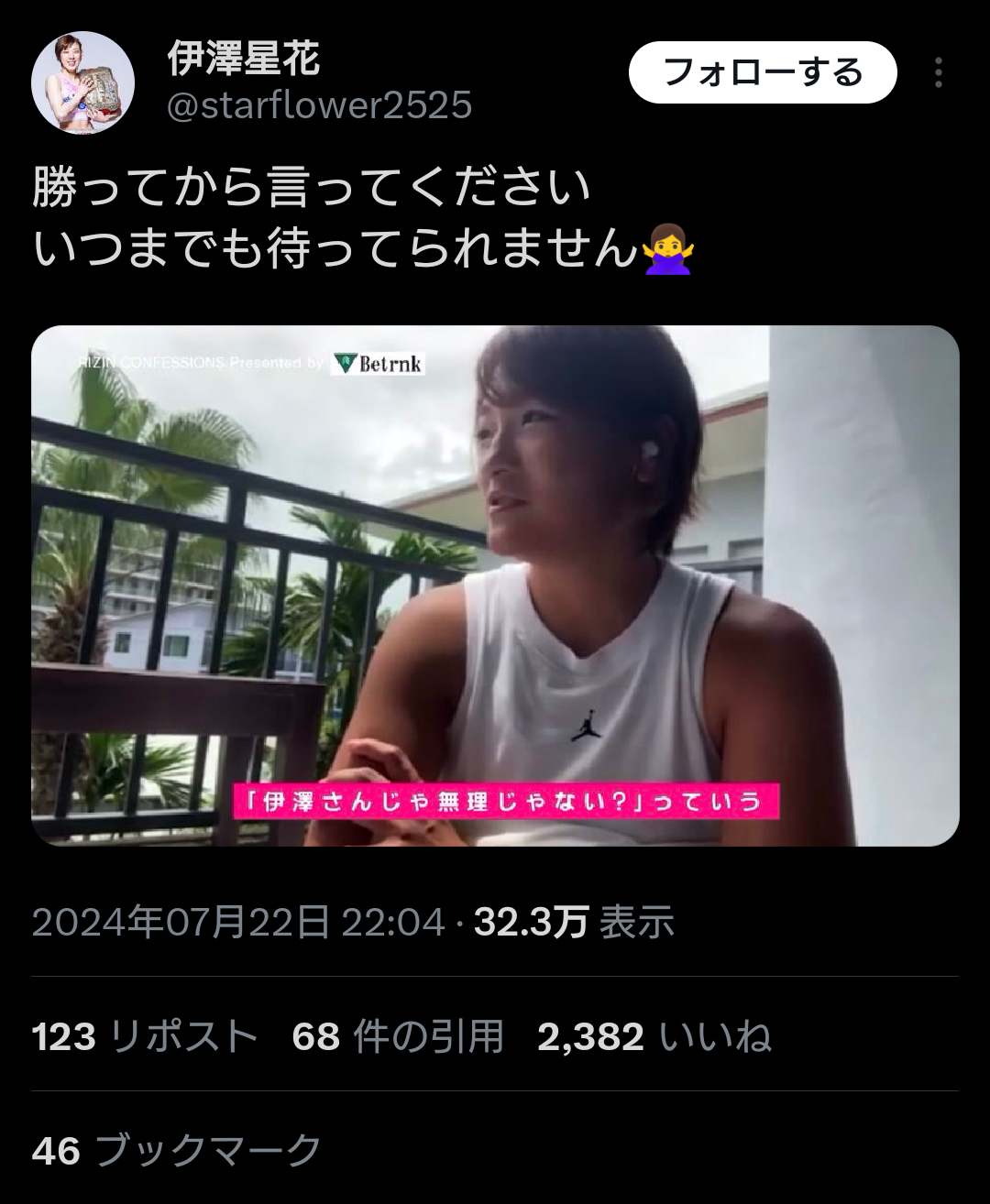 旦那じゃなくても格闘家で13勝0敗8フィニッシュの伊澤に言い返せる奴はいないよな🥲
