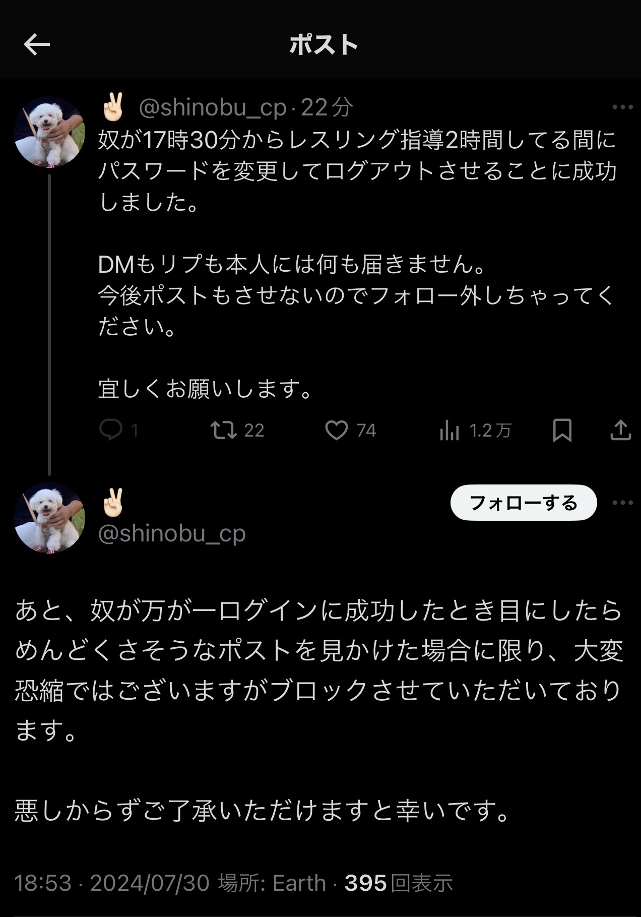本人は今後ログインしませんので、フォロー外していただけますと幸いです。