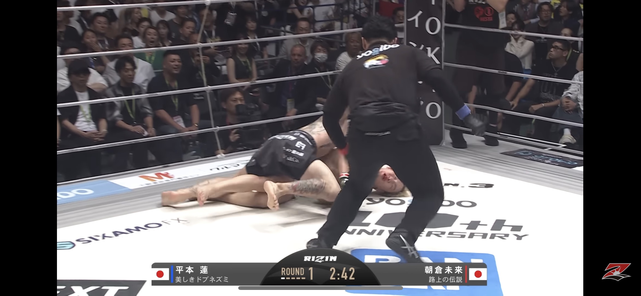 未来はタックルフェイントしてたけど平本が全然反応してくれなくて、逆に平本のフェイントには未来が反応しまくって、下がってコーナー近くのロープ背負いそうなところまで追い込まれたタイミングで二瓶ステップやられてる