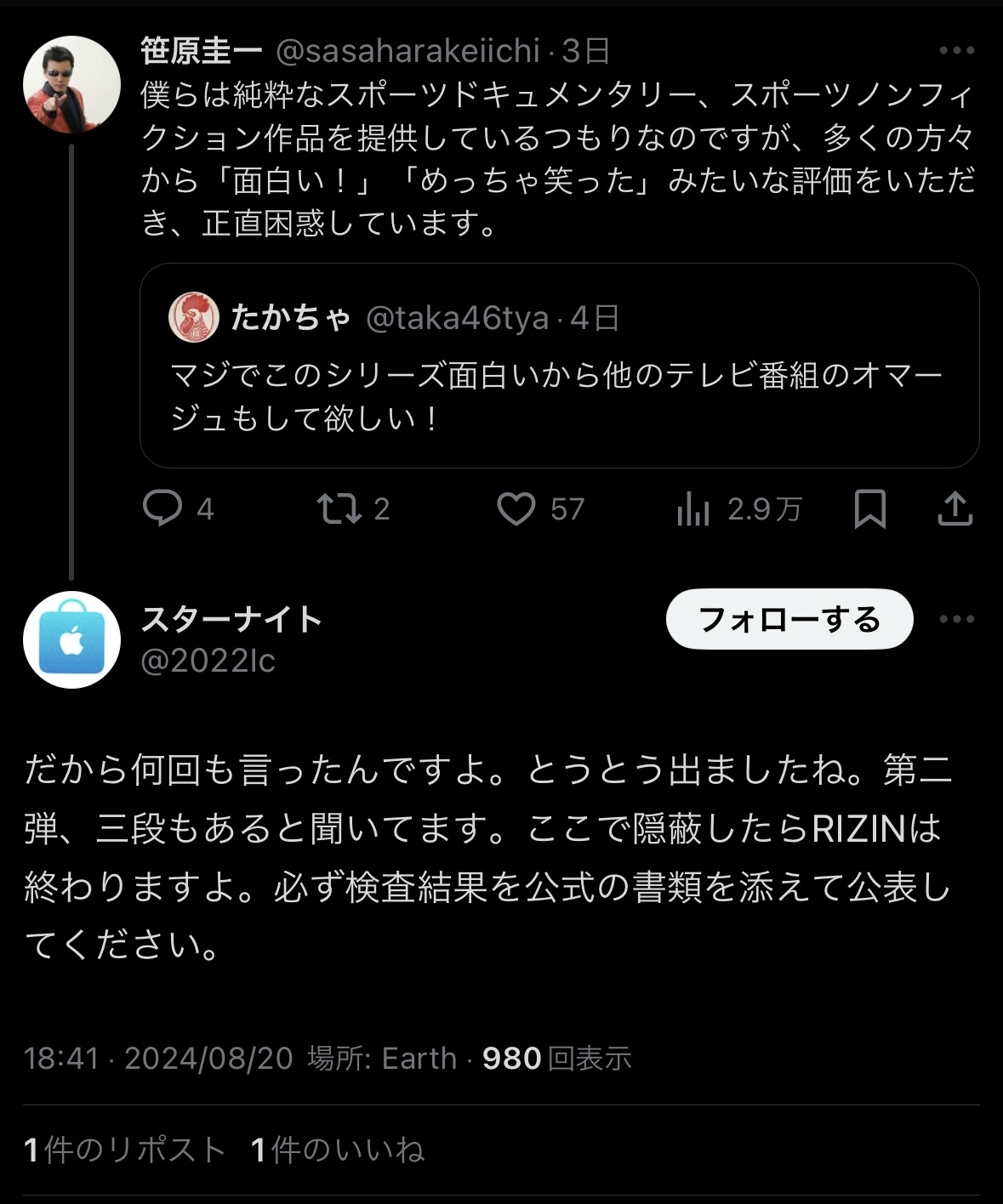 RIZINに守られ公表されないことが分かってますもんね。浮かれるのは分かりますが、後々ご自身の首をしめることになりますよ。色々出ますよ今後。