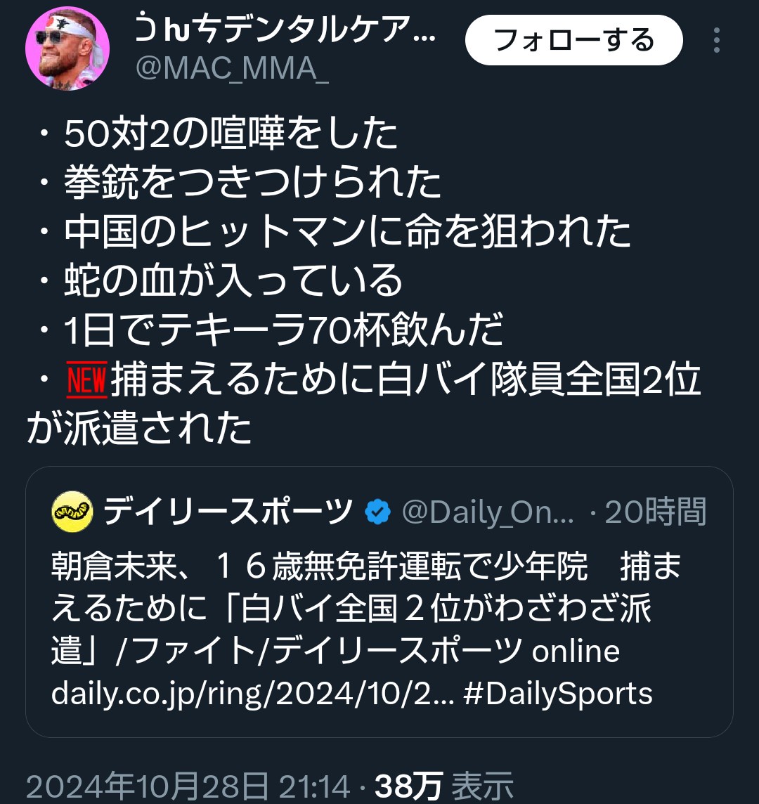 880: 実況厳禁@名無しの格闘家 警備員[Lv.21][苗] (ワッチョイW e9b8-0VdT) 2024/10/28(月) 12:23:15.65 ID:WQ4JiweX0