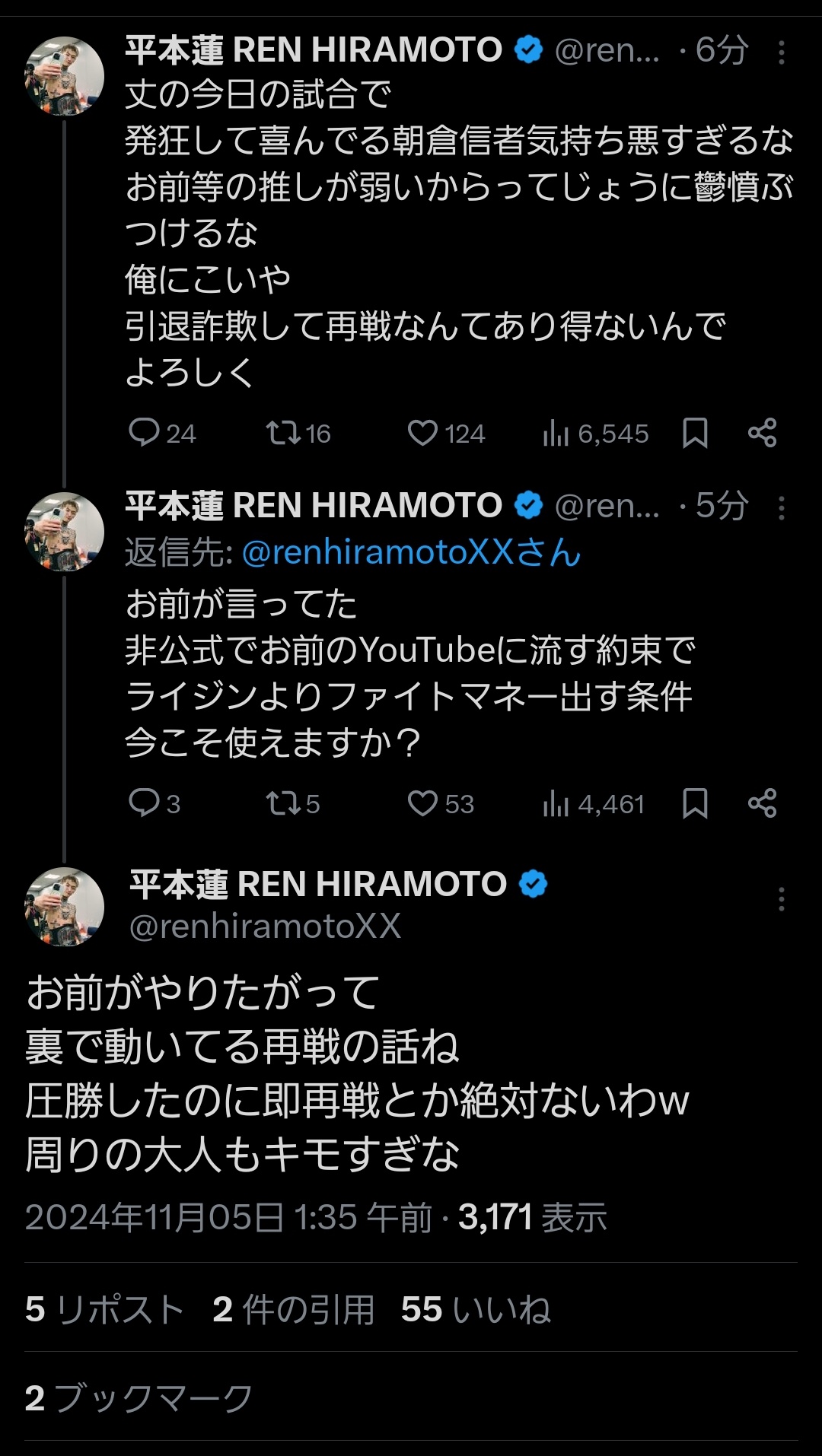 それよりも約束くらい守ってください https://t.co/GNZ72W2DTx— 平本蓮 REN HIRAMOTO (@renhiramotoXX) November 4, 2024
