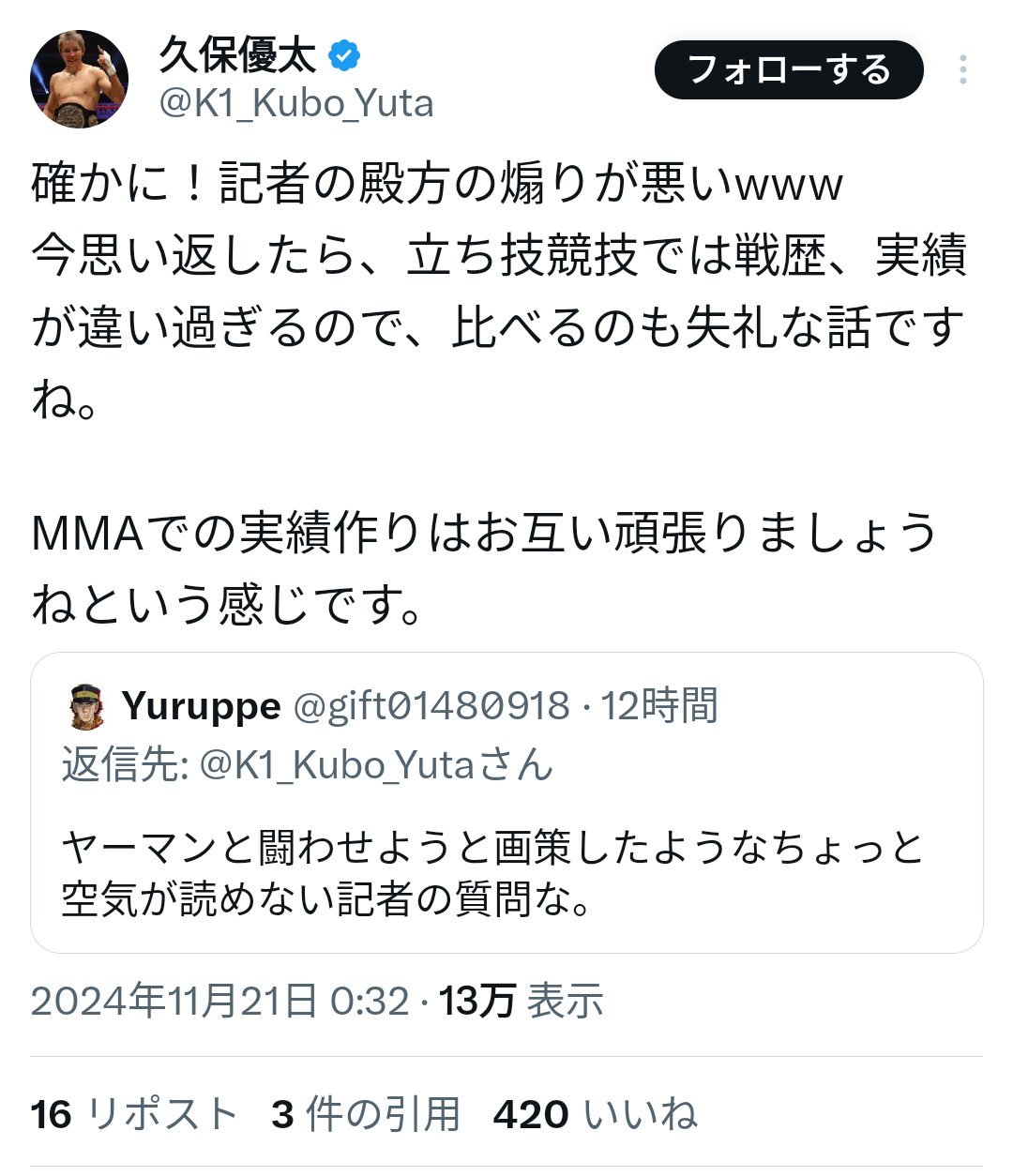 756: 実況厳禁@名無しの格闘家 警備員[Lv.34][苗] (ワッチョイ 7b8b-KrXD) 2024/11/21(木) 03:01:32.81 ID:OITu/2+g0