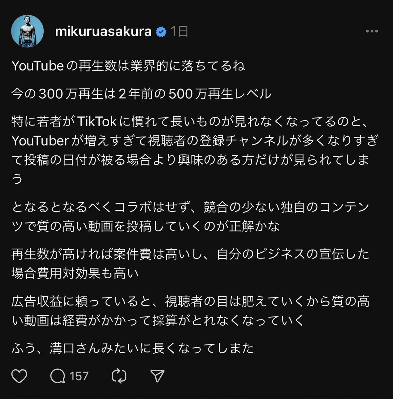 要は再生取れないからもう再生数による広告収益ではなく、企業案件や自分のビジネスの宣伝動画のが収益性が高いと言うことだよね