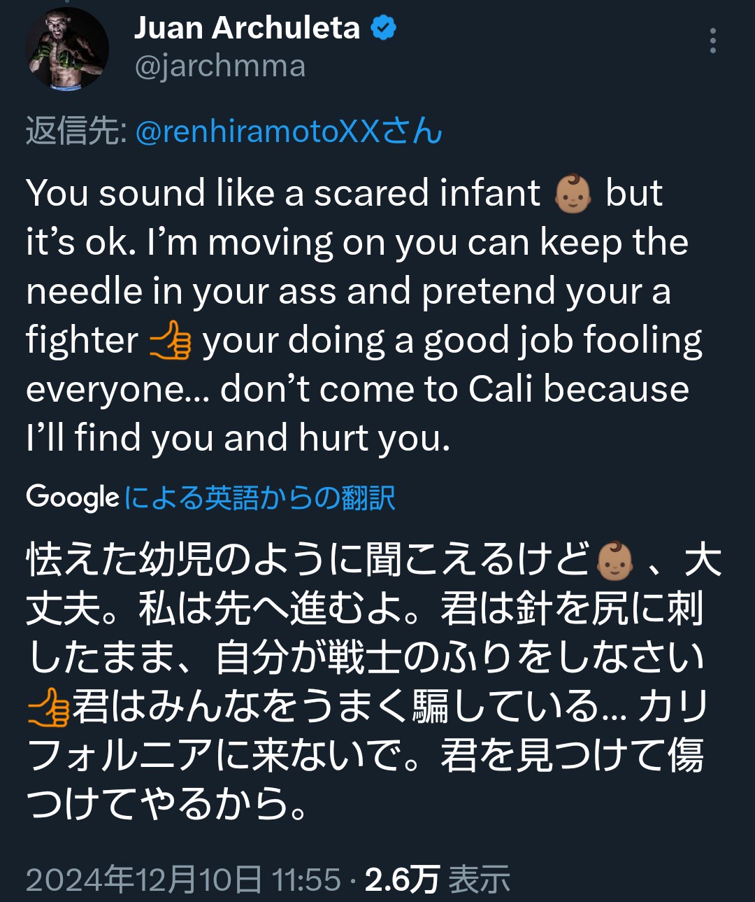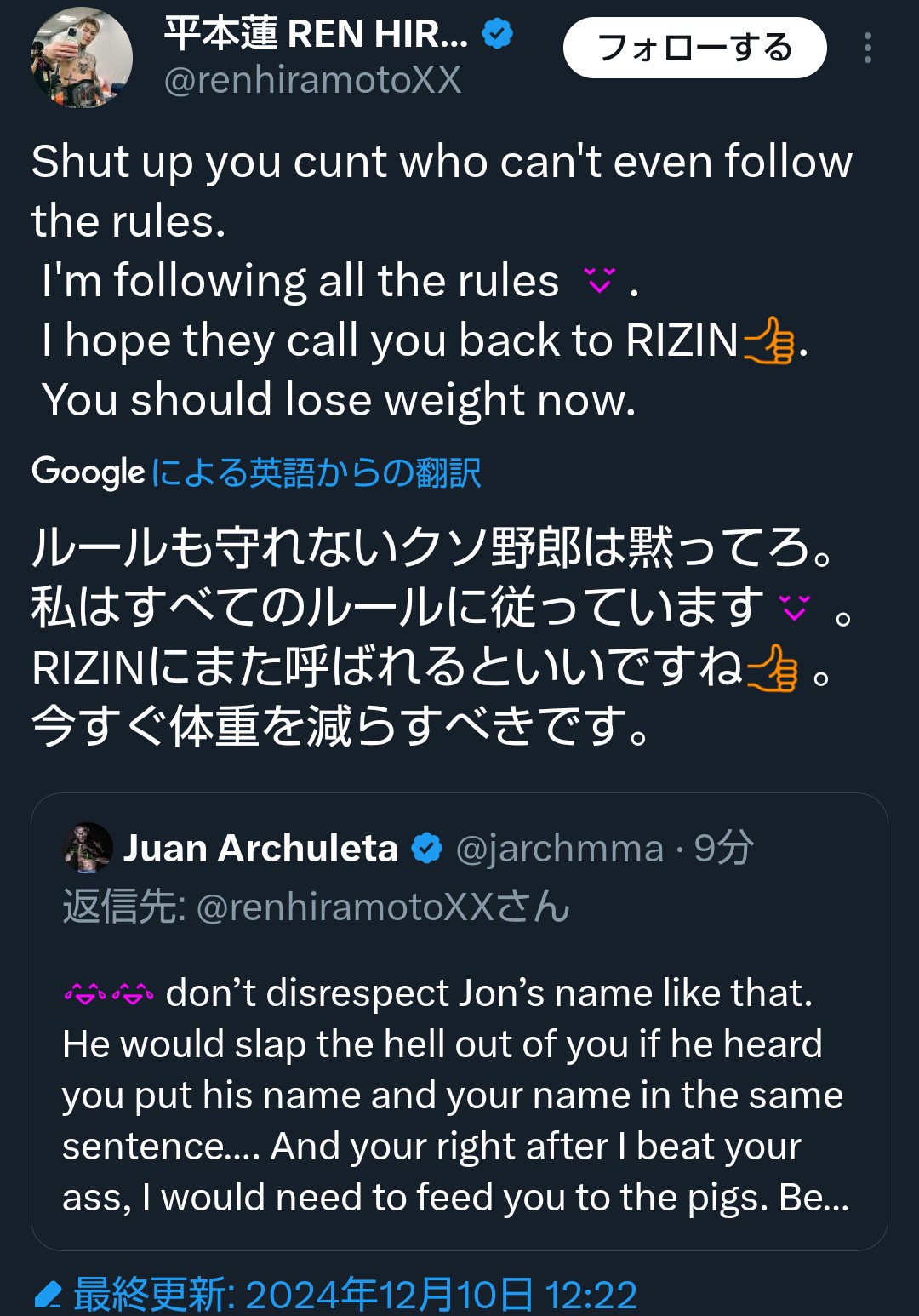 次俺はお前を瞬殺したクレベルとやる@jarchmma https://t.co/o4e5XiOGa1— 平本蓮 REN HIRAMOTO (@renhiramotoXX) December 10, 2024