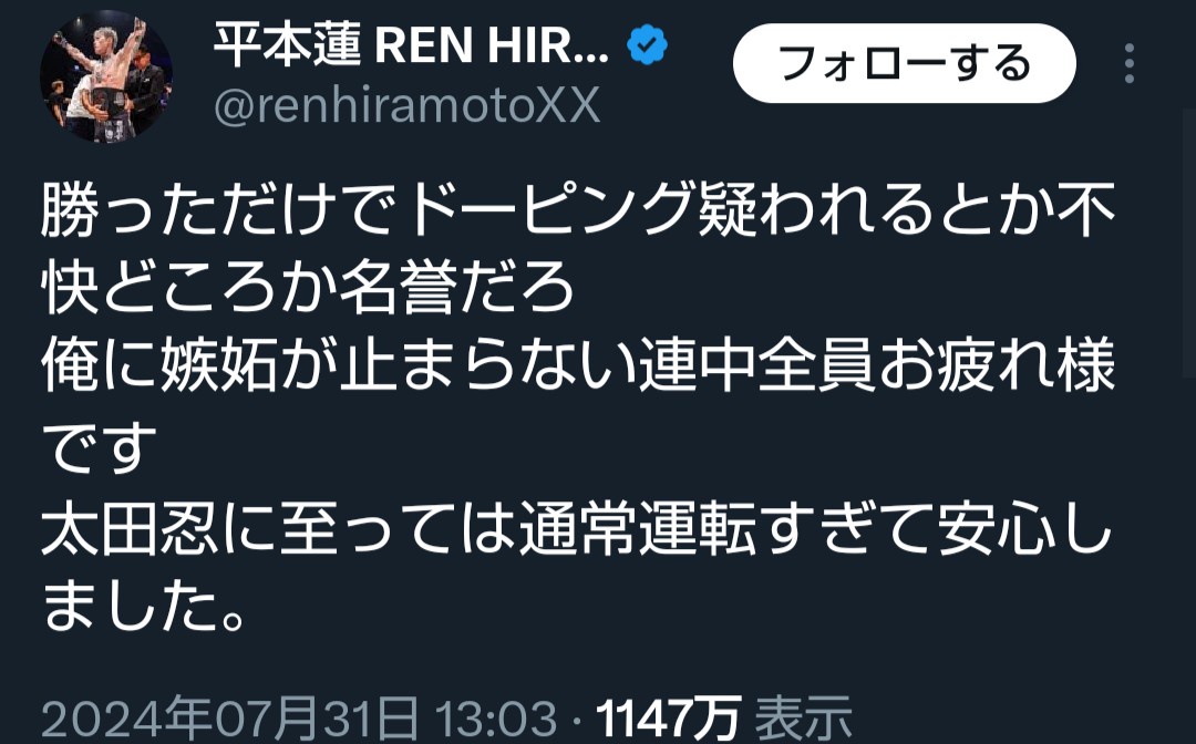 平本ドーピングなしでも負けてただろうけどドーピングのせいで負けたみたいになってるし