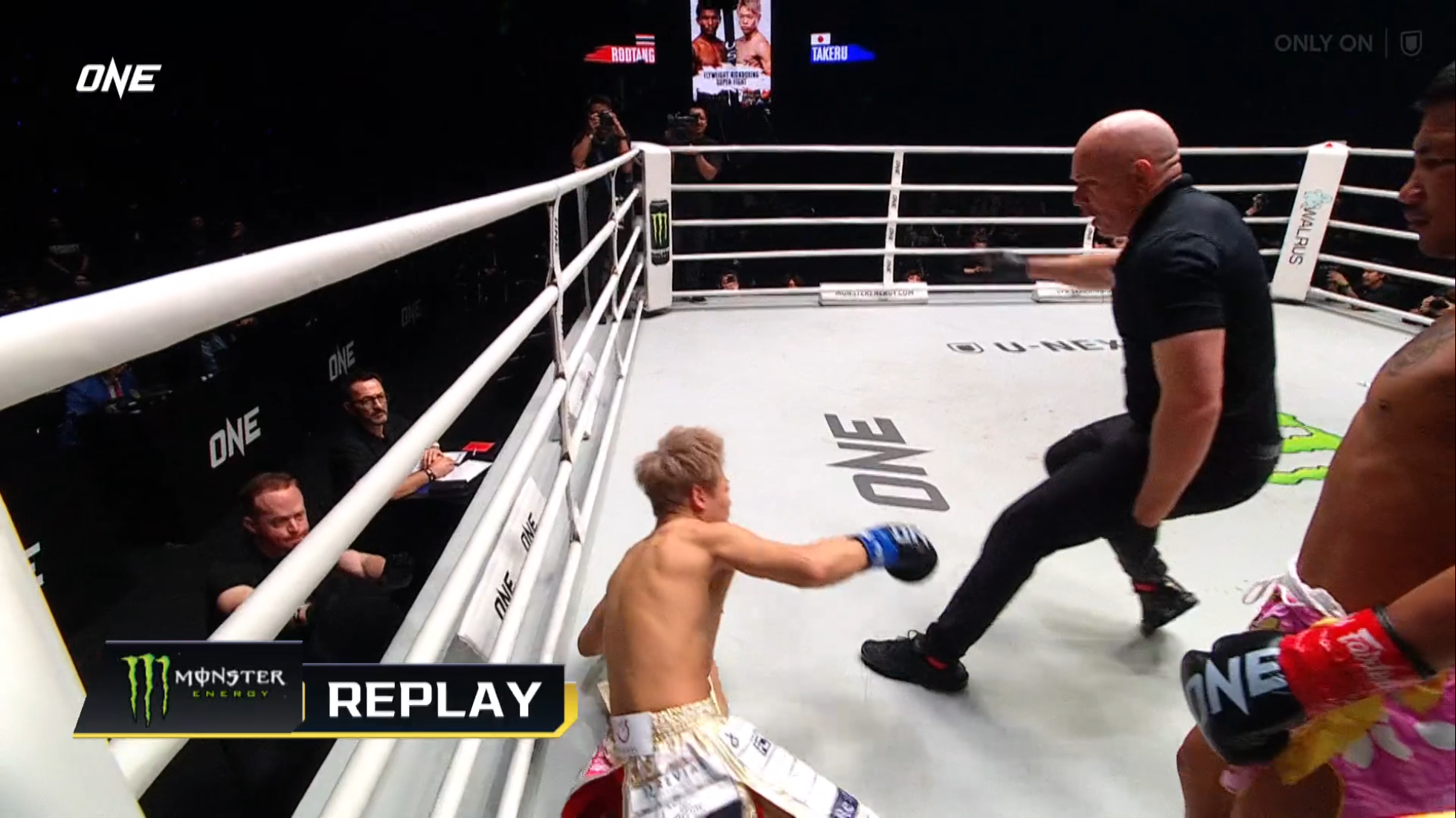 倒される直前にタケルも右合わせてるけどロッタンが前出て威力殺してる