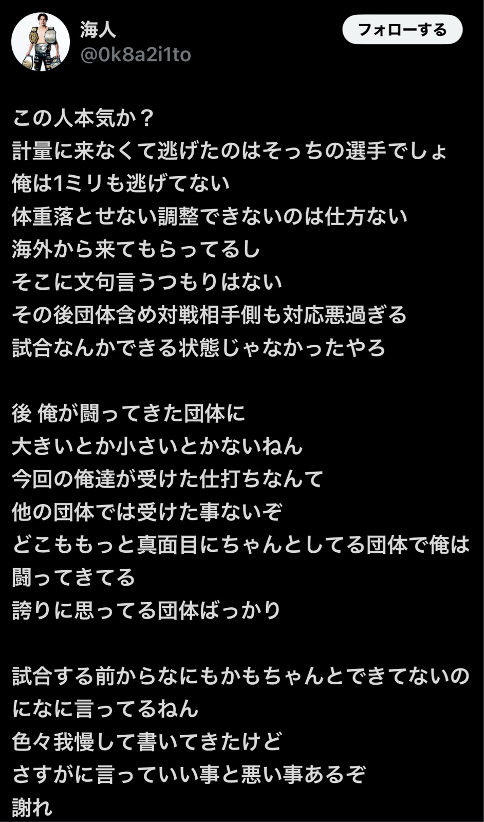 この人はなにを思って、こんな狂った事言うてんやろ。逃げたのはグレゴリアンで海人じゃない!体重オーバーの事だけ言うてるけど、体重の事は仕方ないと思ってるし、1キロオーバーだろうと2キロオーバーだろうと、こっちはやるって伝えてるやろ!その上でこっちは、計量規定時間内まで待った。