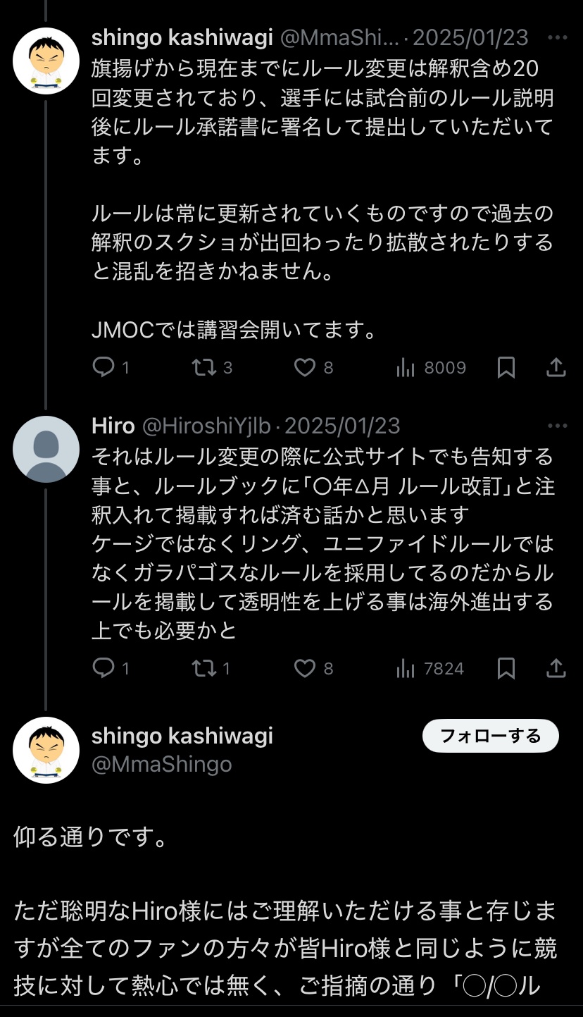 神龍扇久保戦で神龍にジェネラルシップがつかなかったことに対してJMOC公式回答が「単にグラウンドで上になるだけではジェネラルシップとは認めない。そこからパンチを打つなりしてダメージを与えないと」と回答してる