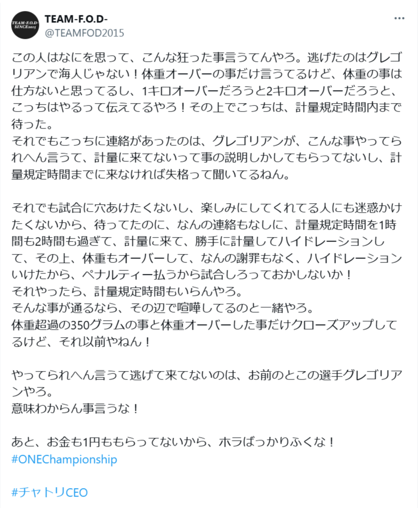 グレゴリアンは計量ミスだから悪いしONEも杜撰すぎるしチャトリの海人批判も公の場で言うべきじゃない
