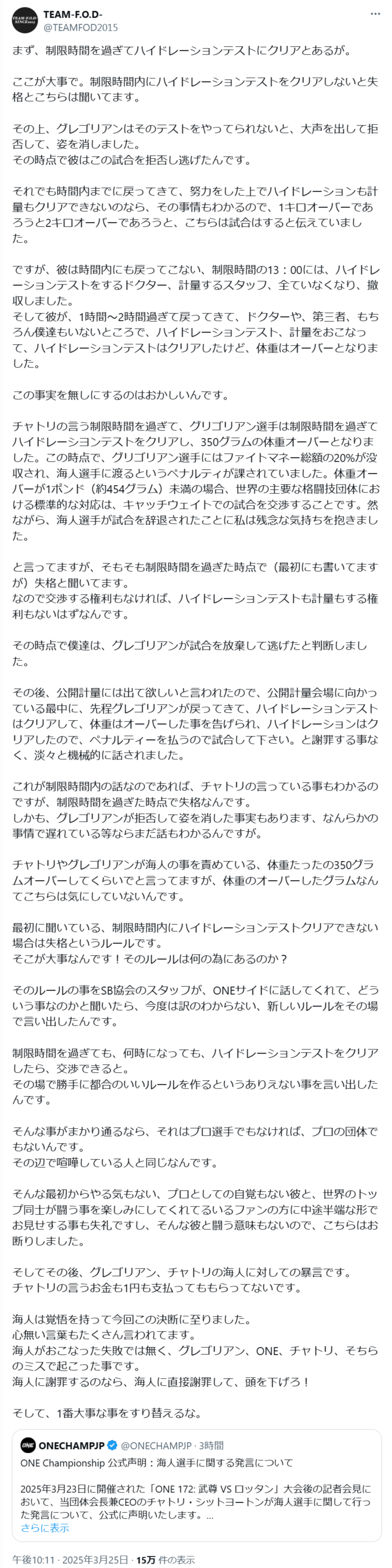 ONEはすべての選手に同じルールを適用し、公正で透明性のある大会運営を行っています。この声明がこの事例の正確な理解につながることを願い、今後も一貫したルールと最高レベルの誠実性、透明性、医療・安全基準をもって大会を運営してまいります。