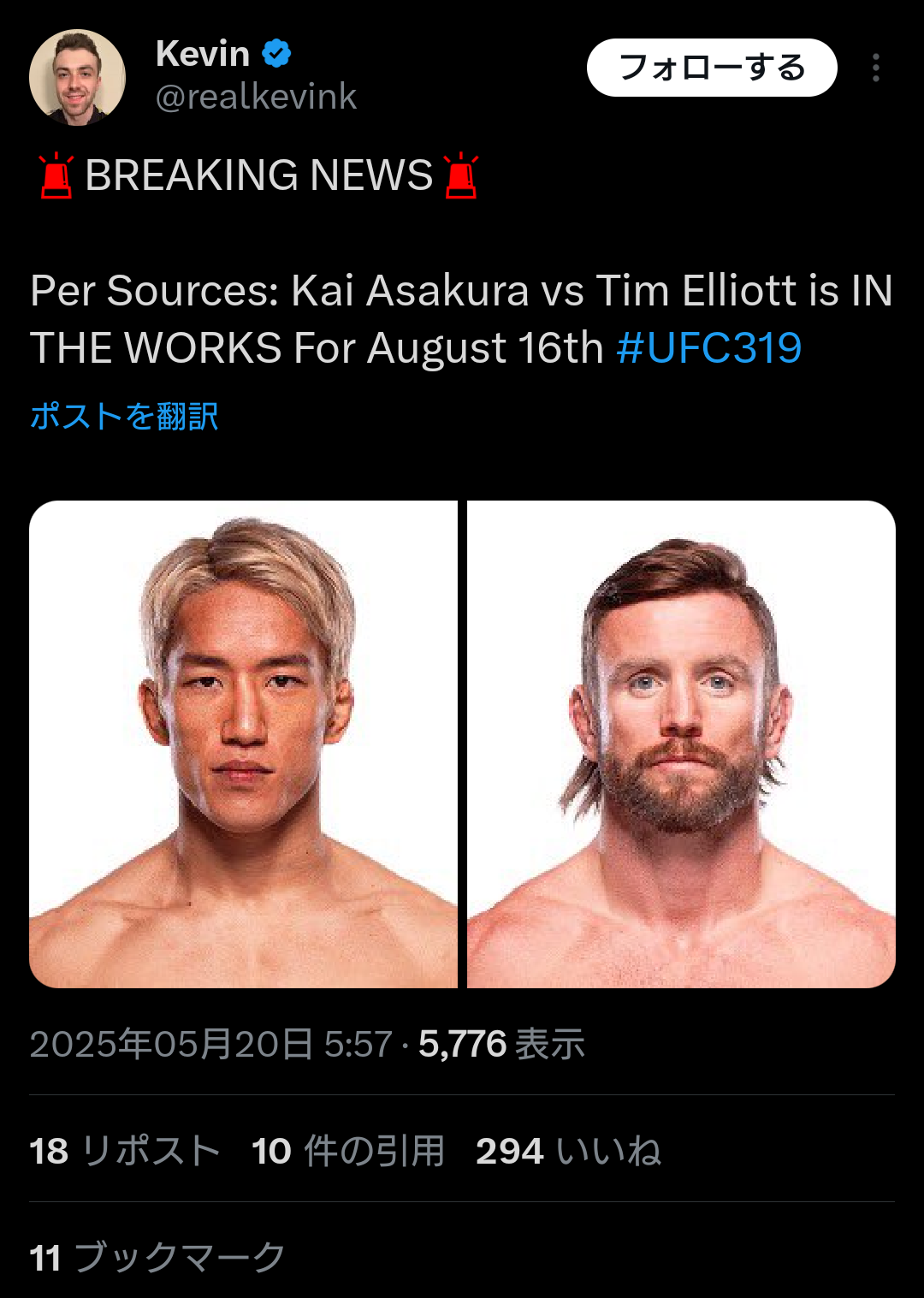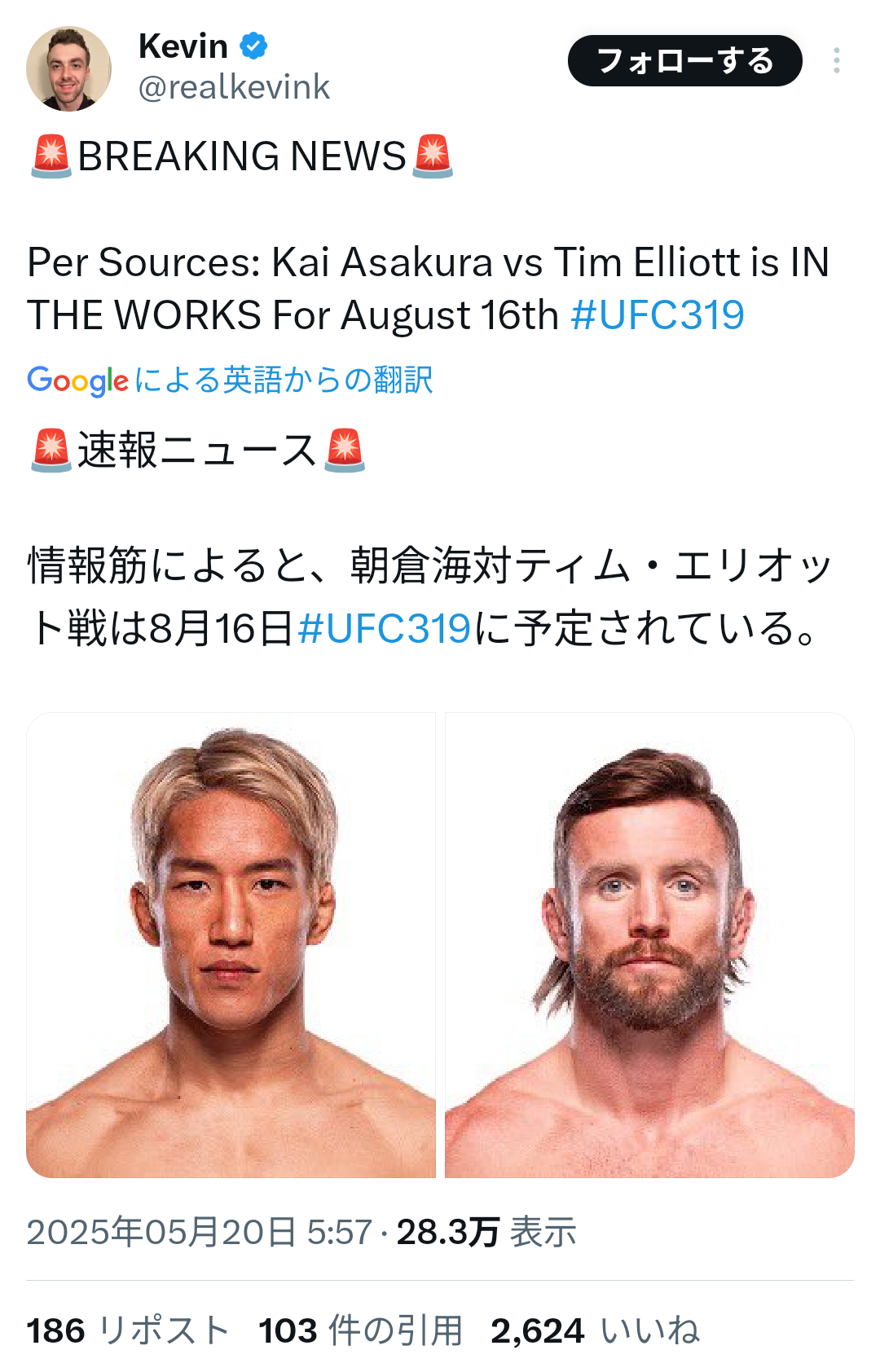 情報筋によると、朝倉海対ティム・エリオット戦は8月16日#UFC319に予定されている。