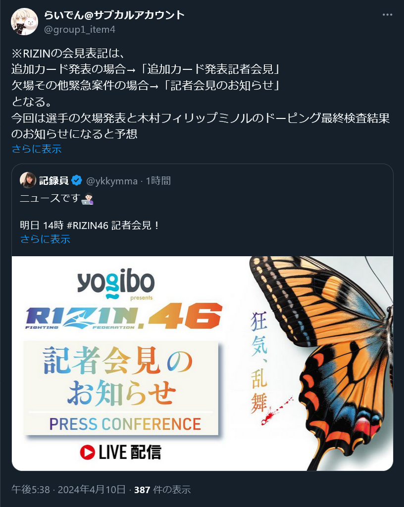 RIZIN4/11(木)昼2時記者会見 RIZIN46で欠場者か