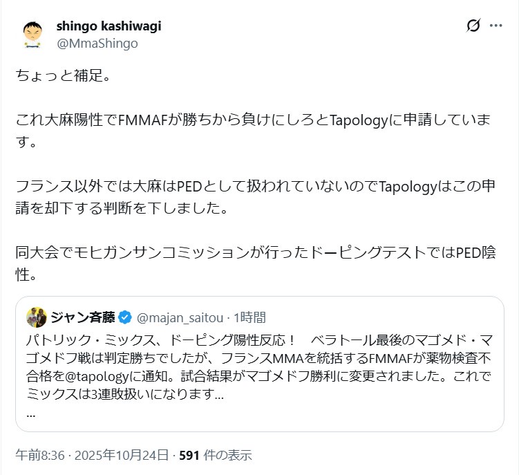 謎にタポロジーにミックスが薬物検査失格したから勝敗を負けにしてくれと通告しただけだわ