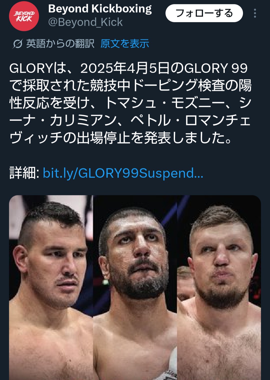 GLORYは、2025年4月5日のGLORY 99で採取された競技中ドーピング検査の陽性反応を受け、トマシュ・モズニー、シーナ・カリミアン、ペトル・ロマンチェヴィッチの出場停止を発表しました。