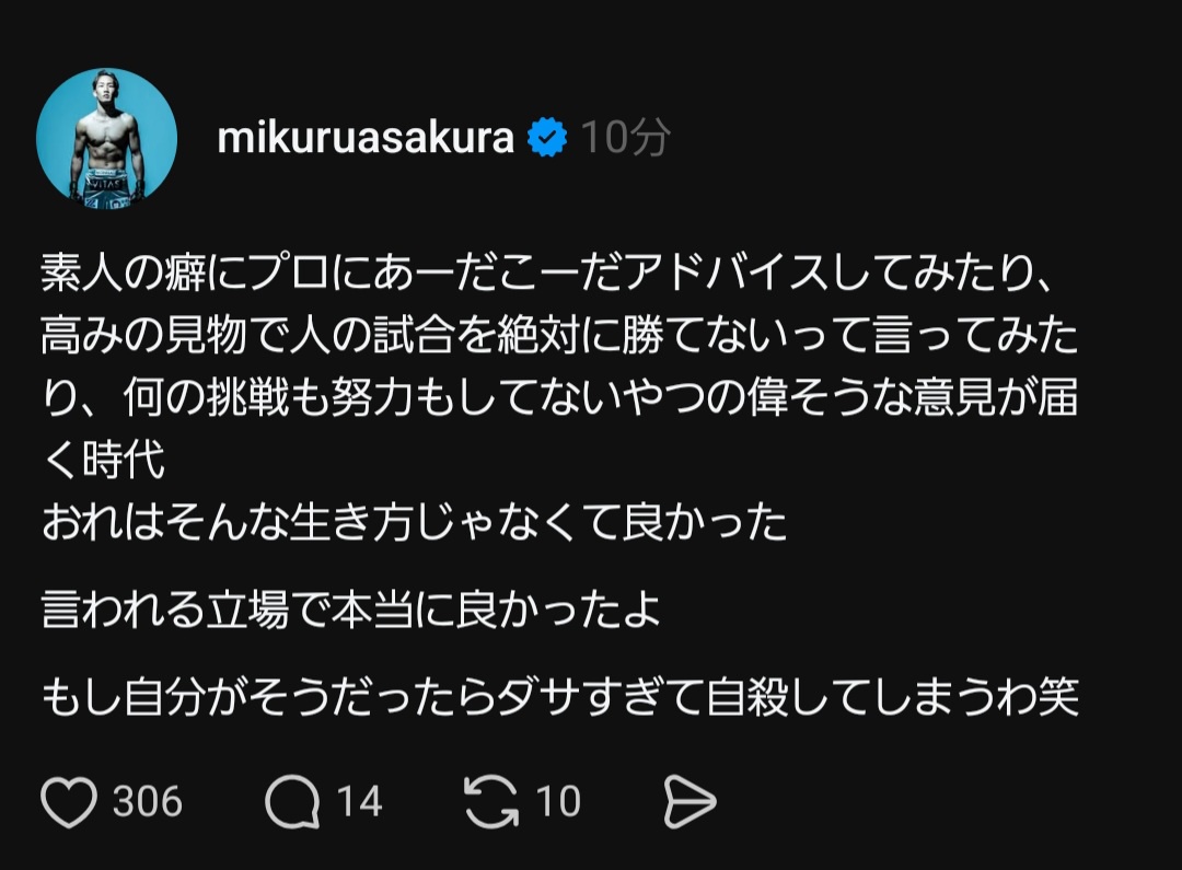 SNSの素人の意見が気に入らないんならリングで結果出して黙らせればいいだけの話、それが格闘家でしょ