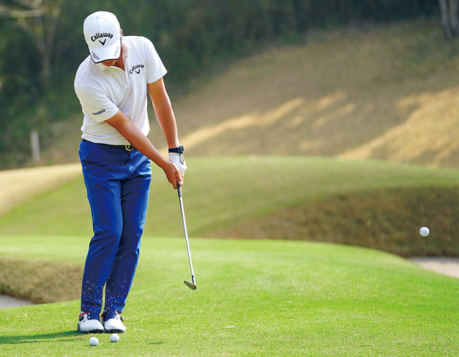 手前で落ちてもバウンスきかせてインパクトからフォローにかけてたてて芝削るだけ